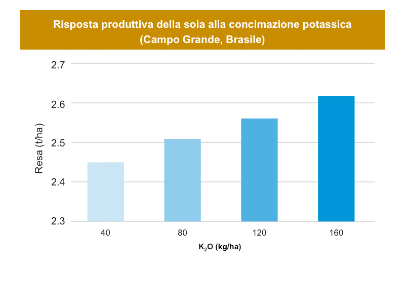 Per ogni tonnellata di granella prodotta, la soia assorbe fino a 30 kg di K2O e 7 kg di MgO, di cui 15-20 kg di K2O e 4-5 kg di MgO vengono asportati con il seme raccolto (ed equivalenti a 25-35 kg di MOP e 15-20 kg di ESTA Kieserit gran. oppure 40-50 kg di Korn-Kali).